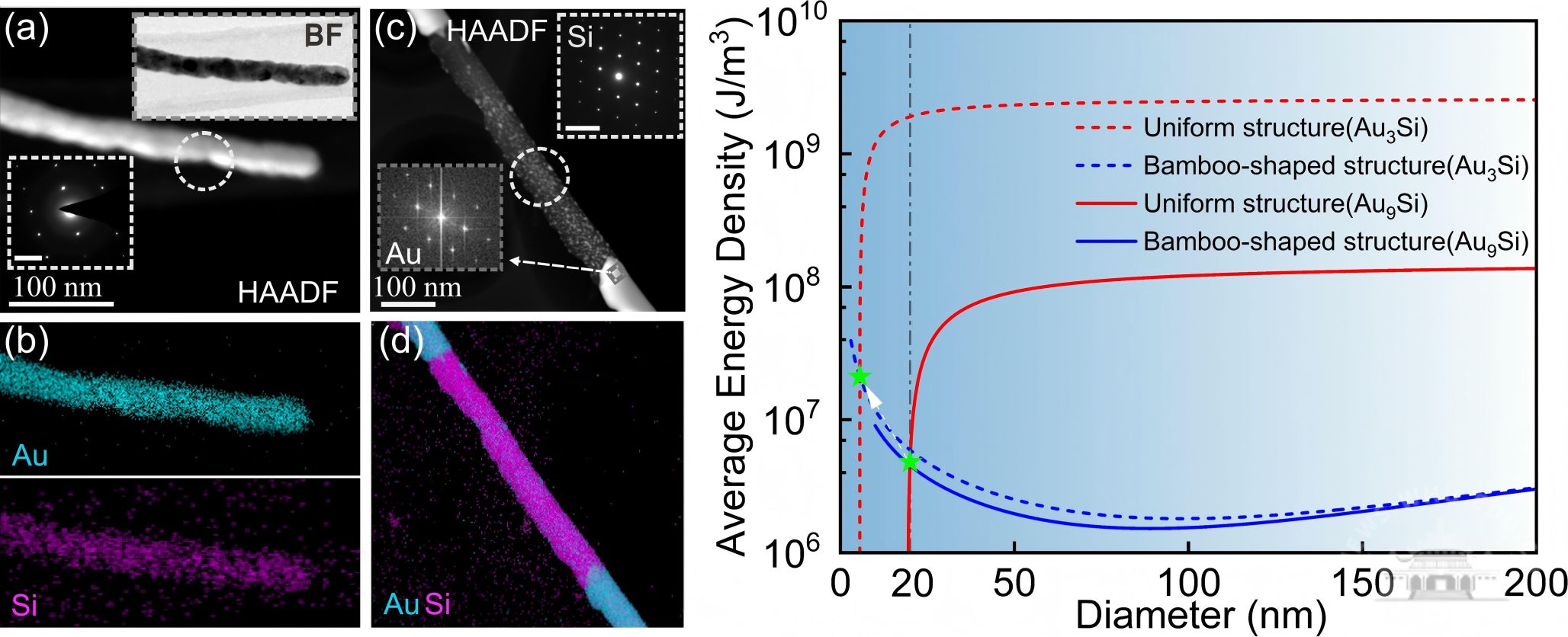 研究团队从热力学竞争的角度出发,建立了考虑混合焓、构型熵、应变能和界面能贡献的相态-能量图谱。结果表明,由于Au、Si原子在尺寸和化学键上的显著差异,其均匀化会引入剧烈的晶格畸变,从而导致极高的应变能,使得大尺寸下AuSi合金相在能量上极不稳定。但在纳米尺度下,高比表面积引起的小尺寸效应使得材料模量降低,显著削弱了应变能作用,使得Au、Si元素均匀分布的单晶合金相在热力学上趋于稳定。