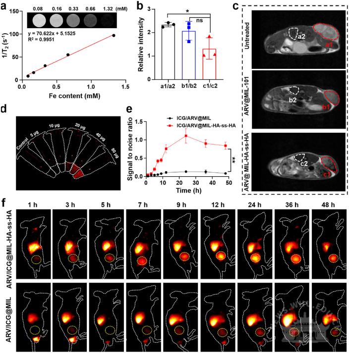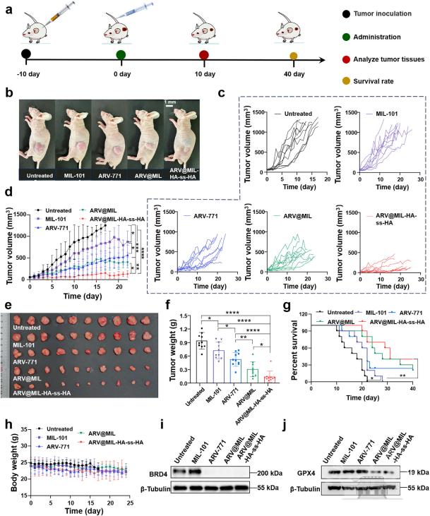 研究设计并构建了一种多功能纳米PROTAC平台ARV@MIL-HA-ss-HA,其核心思路是利用铁基MOF MIL-101作为载体负载ARV-771,并在表面修饰由二硫键交联的透明质酸(HA-ss-HA)水凝胶。该水凝胶一方面通过HA与肿瘤细胞高表达的CD44受体相互作用实现主动靶向,另一方面在肿瘤细胞内高GSH环境中发生二硫键断裂,触发药物响应性释放。MIL-101载体本身可作为纳米酶,在肿瘤细胞内催化H₂O₂生成·OH并消耗GSH,诱导铁死亡;同时释放的ARV-771通过降解BRD4蛋白,既直接抑制肿瘤生长,又进一步增强细胞对铁死亡的敏感性,从而实现双重协同治疗。研究通过体外细胞实验、蛋白组学分析、体内肿瘤模型、MRI与荧光成像等手段,系统评估了该纳米平台的靶向性、药物释放特性、BRD4降解能力、铁死亡诱导效应、抗肿瘤疗效及生物安全性。