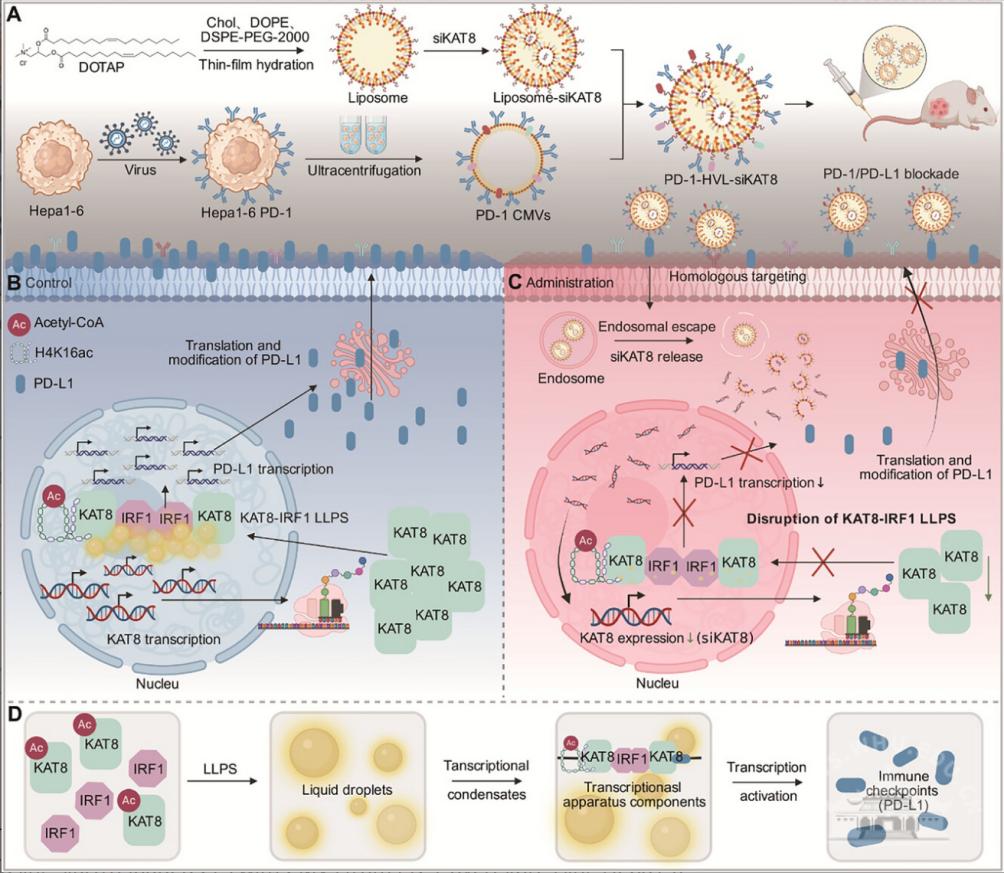 基于上述发现,研究团队进一步构建了一种PD-1功能化杂化囊泡-脂质体递送材料(PD-1-HVL–siKAT8)。该材料兼具局部PD-L1阻断和KAT8靶向沉默双重作用,一方面通过表面PD-1实现对肿瘤细胞PD-L1的局部阻断,另一方面递送靶向KAT8的小干扰RNA,从源头瓦解维持PD-L1持续表达的相分离凝聚体,实现“表面阻断+源头抑制”的协同干预。