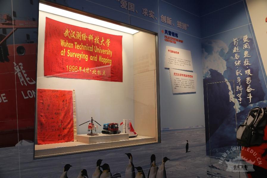 展厅里还有两面意义非凡的旗帜:上方是武大人首次抵达北极点的北极点旗,下方是第二次南极科考队员的签名旗。一面浸染着零下40度的呼吸,一面记录着被极光“亲吻”过的名字。
