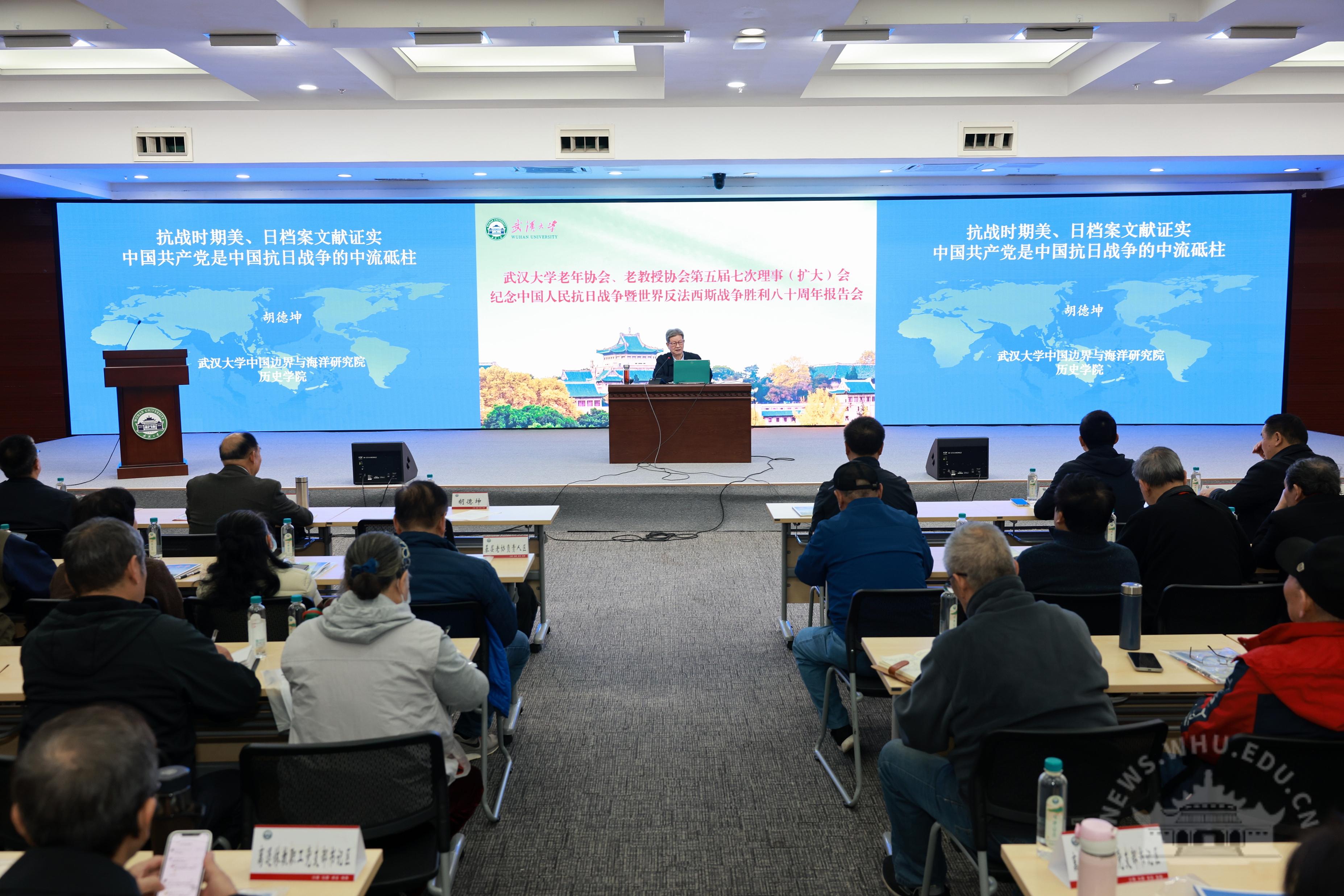 新闻网讯(通讯员梁芳)10月22日,武汉大学老年协会、老教授协会(以下简称“校老协”)召开五届七次理事(扩大)会暨纪念中国人民抗日战争暨世界反法西斯战争胜利八十周年报告会。人文社科资深教授胡德坤作专题报告,珞珈银龄志愿服务团分团长代表交流工作。校党委副书记屈文谦出席活动。