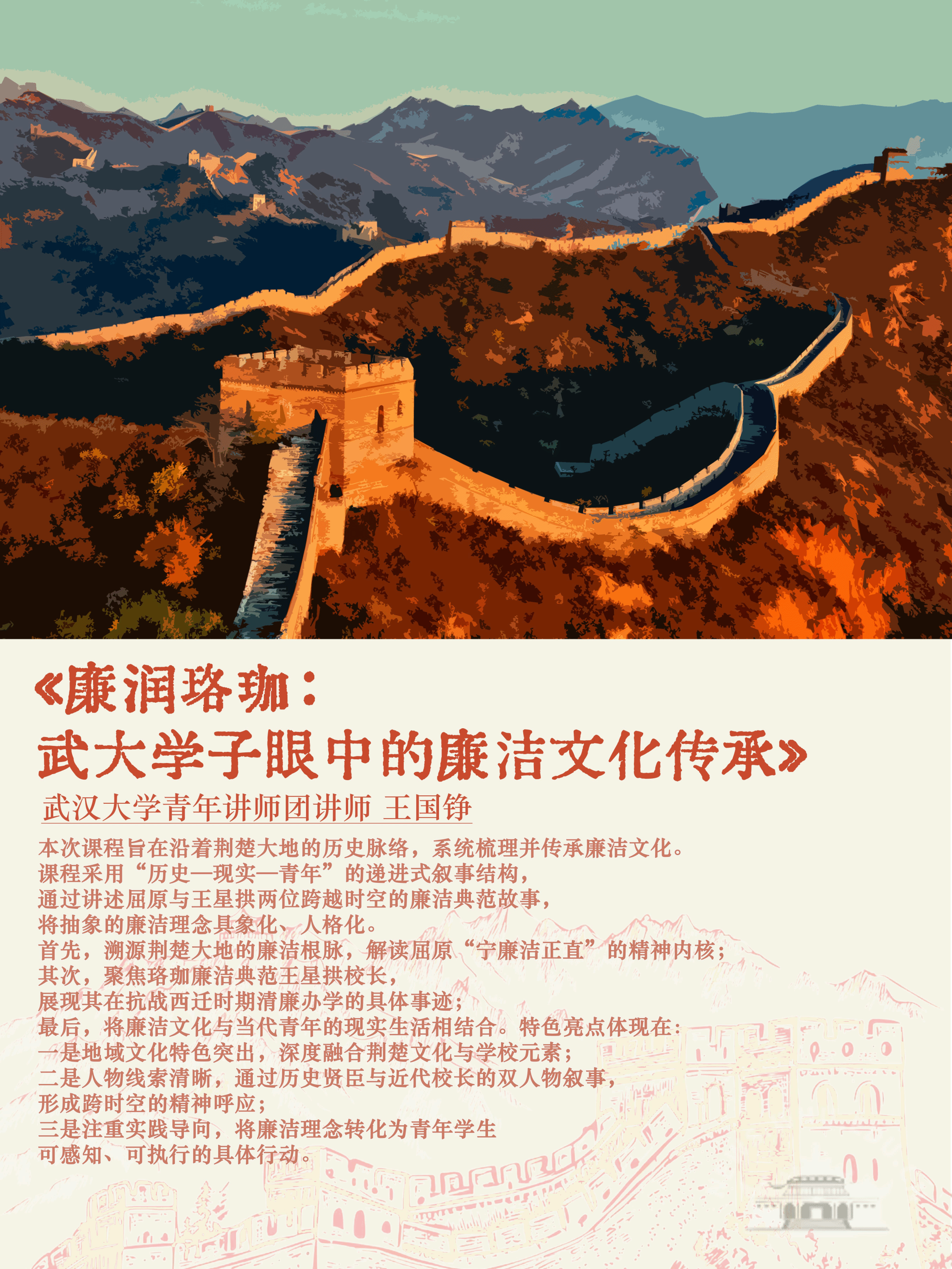 微网课《“珞珈廉风” 基于校史地脉与文化传承的廉洁教育创新实践》由武汉大学青年讲师团精心打造,学生分团讲师、马克思主义学院2024级硕士研究生王国铮担任主讲人。作品将屈原的“求索”、王星拱的“担当”与当代学子的日常学习生活紧密结合,提出“廉洁是融入日常的行动指南”。课程采用“沉浸式叙事”策略,通过“松柏苍翠、香樟馥郁”的环境描写与“补丁摞补丁却整洁得体”的细节刻画,引导学子与历史人物产生深度情感共鸣。课程在学生群体中反响良好,学生们通过课程评价、心得分享等方式,表示要从“考试不作弊”“科研不造假”“学生工作不谋私”等点滴做起,将廉洁自律内化为日常行为习惯;许多学生骨干主动将廉洁主题融入班会、团日活动,形成“学习—实践—传播”的良性循环。