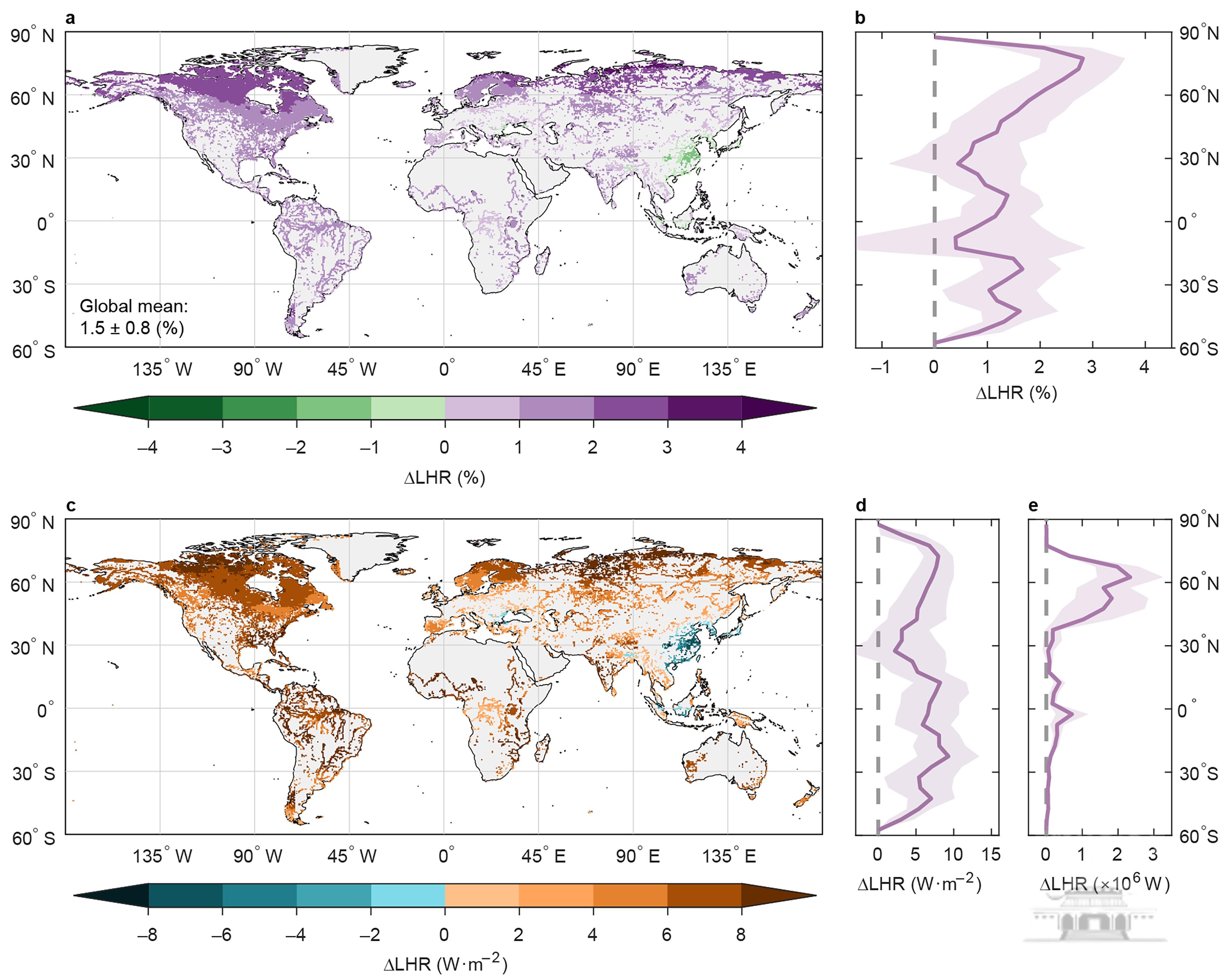 研究表明,历史时期全球湖泊热量释放相对于工业化前水平普遍增加。其中,北半球中高纬度(大于45°N)湖泊表现出增强的热量释放,其增加幅度是低纬度(30°S–30°N)湖泊的2倍。由于全球大多数湖泊分布在北半球中高纬度地区,该区域湖泊的热量释放增加总量可达10.0*106±4.4*106W,而低纬度地区仅为2.7*106±1.5*106W(图1)。