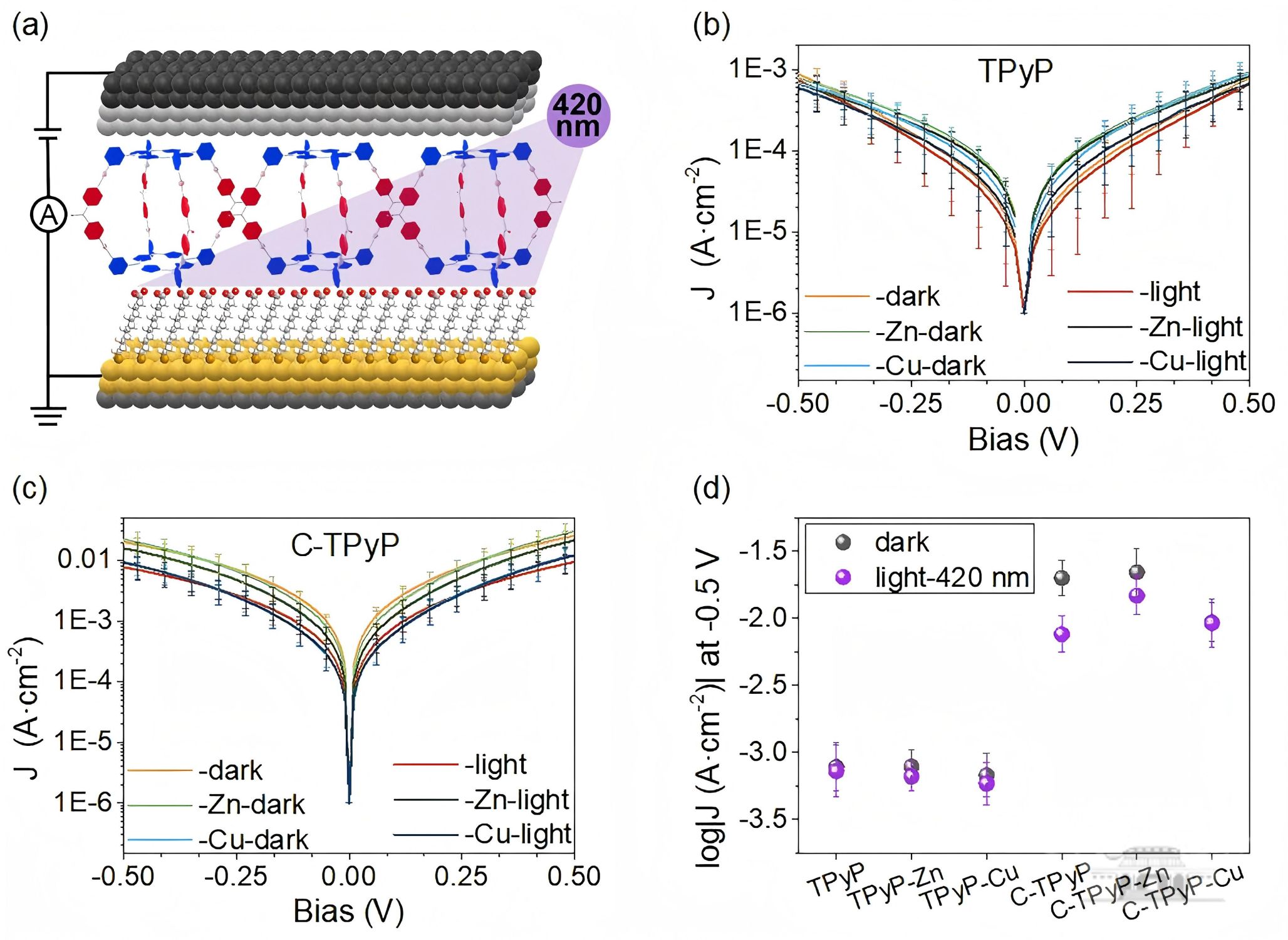 自分子电子学诞生以来,核心目的是设计能够实现特定功能的分子电子器件。超分子结构可精准调节分子间非共价相作用以调控电荷传输,在功能性分子电子器件领域极具前景,但超分子通过外部物理刺激响应并产生特异性电信号的研究尚未系统开展。郭存兰教授和王明教授合作,以刚性配体和卟啉衍生物TPyP为单元,设计合成卟啉金属配位超分子笼,并进一步构建基于该超分子笼的自组装单层膜。通过超分子笼中的刚性配体,调控卟啉基团间相互作用,实现卟啉基分子结的光响应电荷传输。