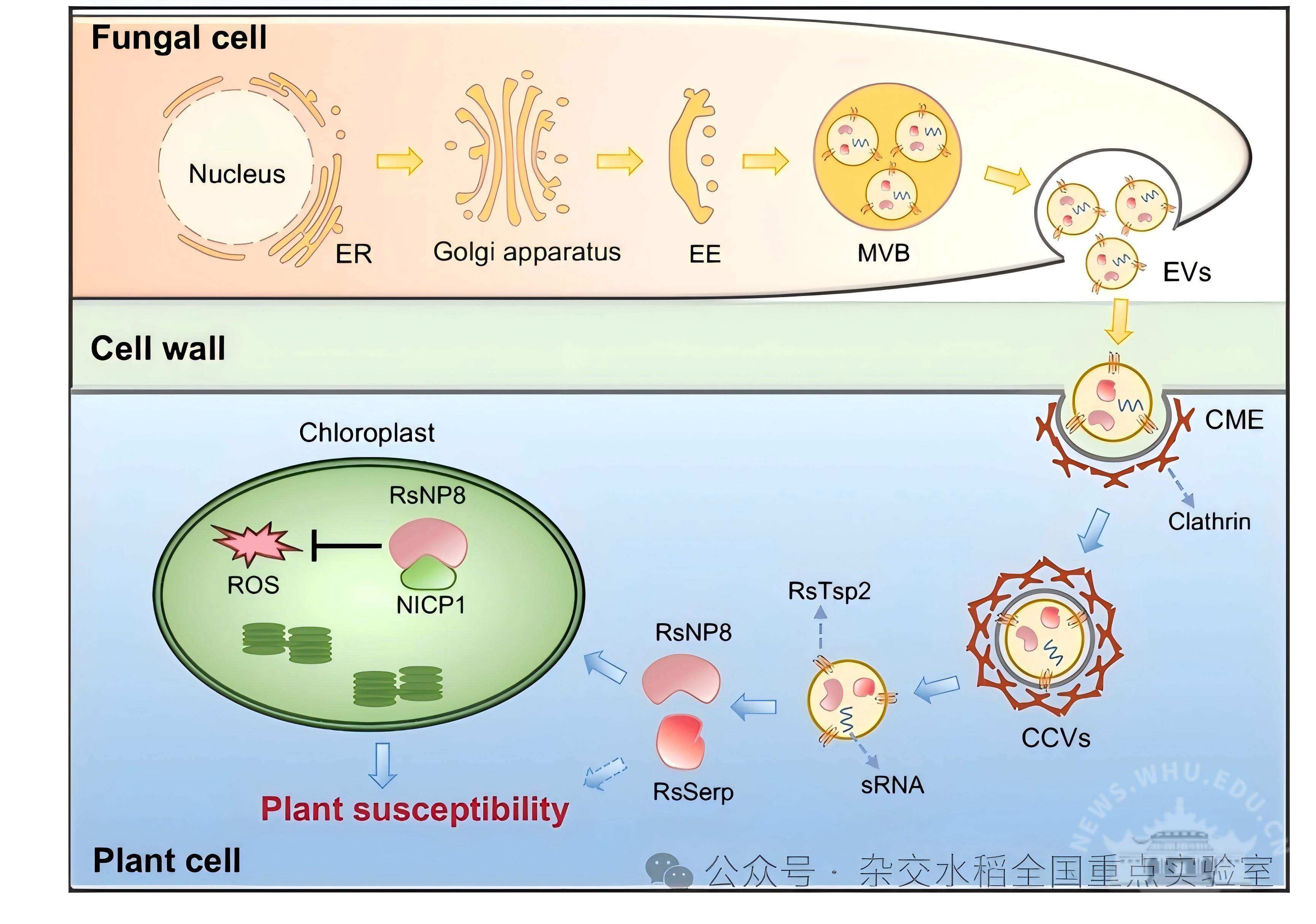 本研究在真菌EVs生物学功能与致病机制研究领域取得重要突破:一方面,揭示了真菌EVs作为毒力效应蛋白跨界转运载体的新功能,拓展了EVs在生物跨界互作中的功能认知;另一方面,阐明了“EVs分泌效应蛋白-宿主CME途径内化-免疫通路靶向抑制”的全新致病机制,系统解析了真菌效应蛋白从分泌、转运到发挥毒力功能的完整分子路径。这些发现构建了病原-宿主互作的理论新框架,为发展基于EVs防控植物病害新策略提供了重要的依据。