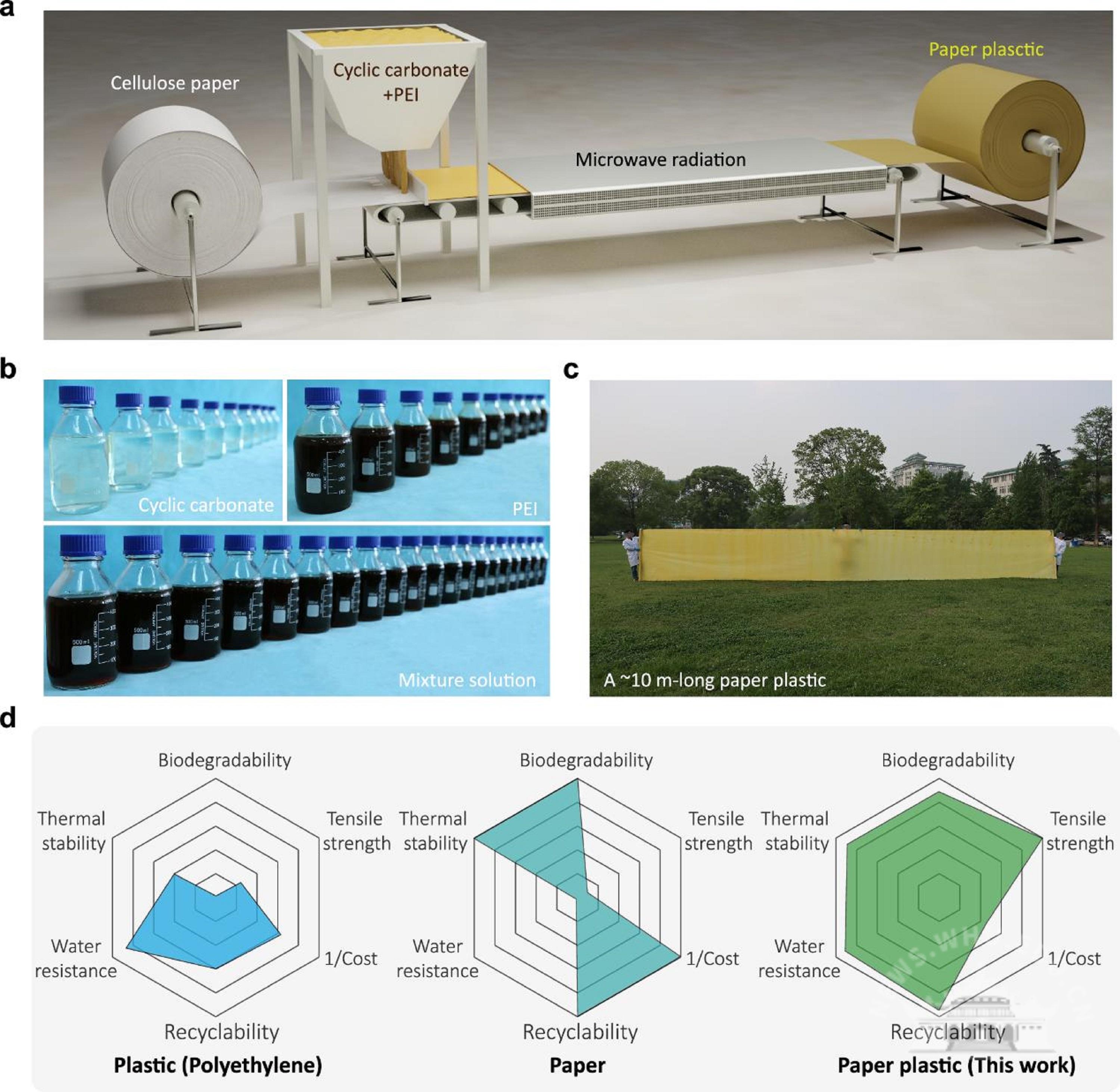 研究团队通过动态氨基甲酸酯化学键与纤维素纸中羟基的相互作用,在微波辐射引发反应后快速且大规模地制备得到纸塑材料,显著提升纤维素纸基产品力学性能、耐水耐溶剂性的同时,保留材料的降解回收性与生物相容性。该项工作阐明了动态聚合物网络与纤维素纸之间的相互作用机理,进而明晰了结构对力学强度增强的机制,为“以纸代塑”的发展方向提供了切实可行的解决方案。