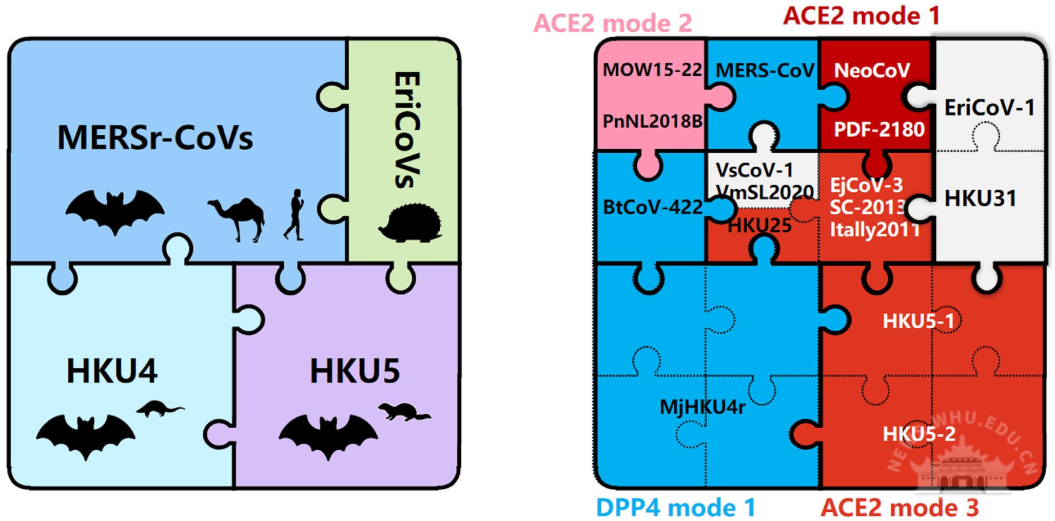 图4 MERS簇冠状病毒受体使用及其识别模式示意图
