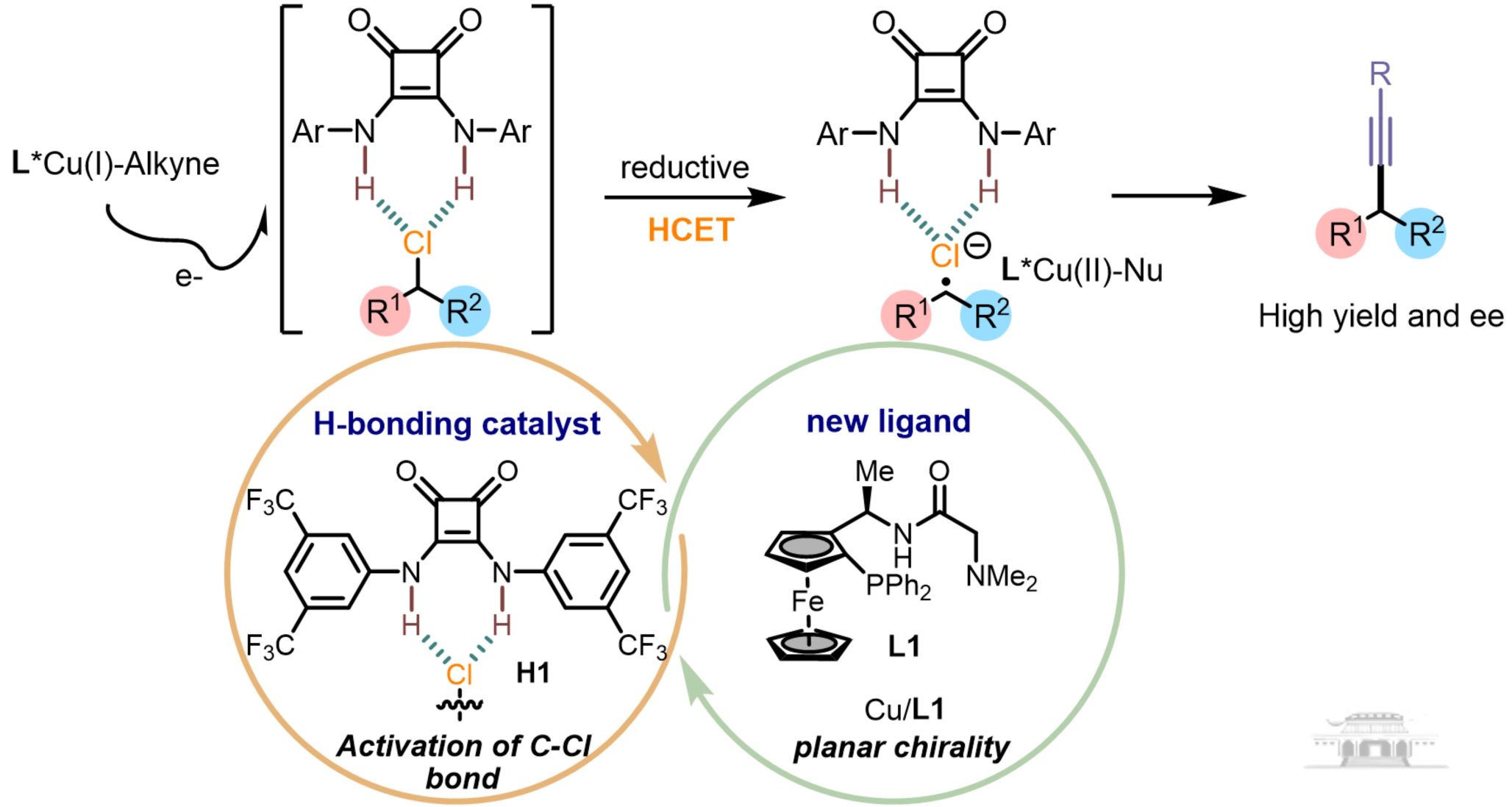 新闻网讯(通讯员化苑)近日,国际化学领域权威期刊《美国化学会志》(Journal of the American Chemical Society)在线发表了武汉大学化学与分子科学学院陈才友教授团队在不对称催化领域的最新研究成果,题为《氢键给体耦合电子转移策略驱动的铜催化不对称自由基炔基化反应》。该研究发展了氢键给体耦合电子转移(HCET)驱动的过渡金属催化不对称自由基交叉偶联反应,成功实现了低活性烷基氯的高效、高对映选择性炔基化。
