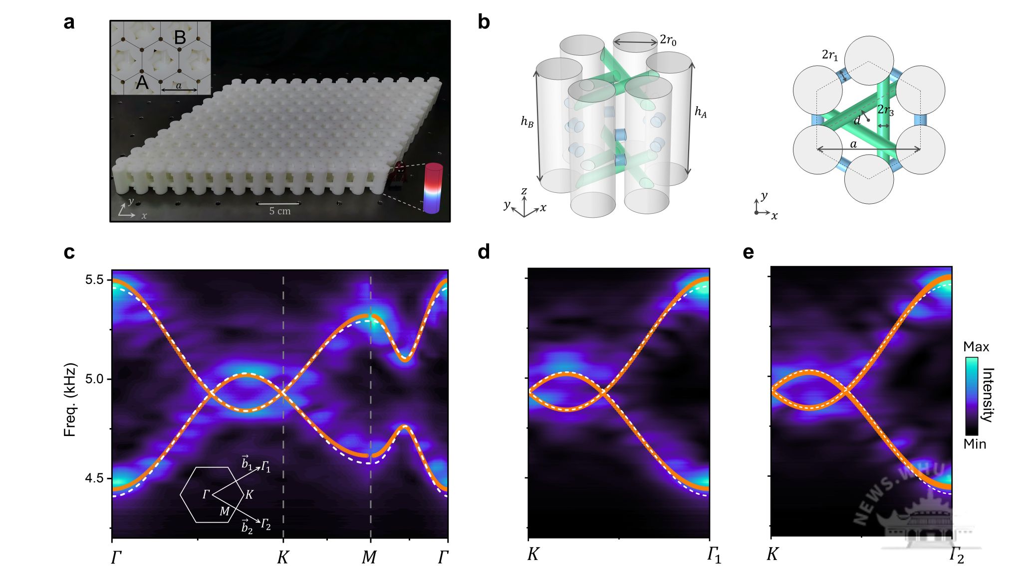 图1:声子晶体样品与声学卫星狄拉克锥的实验观测