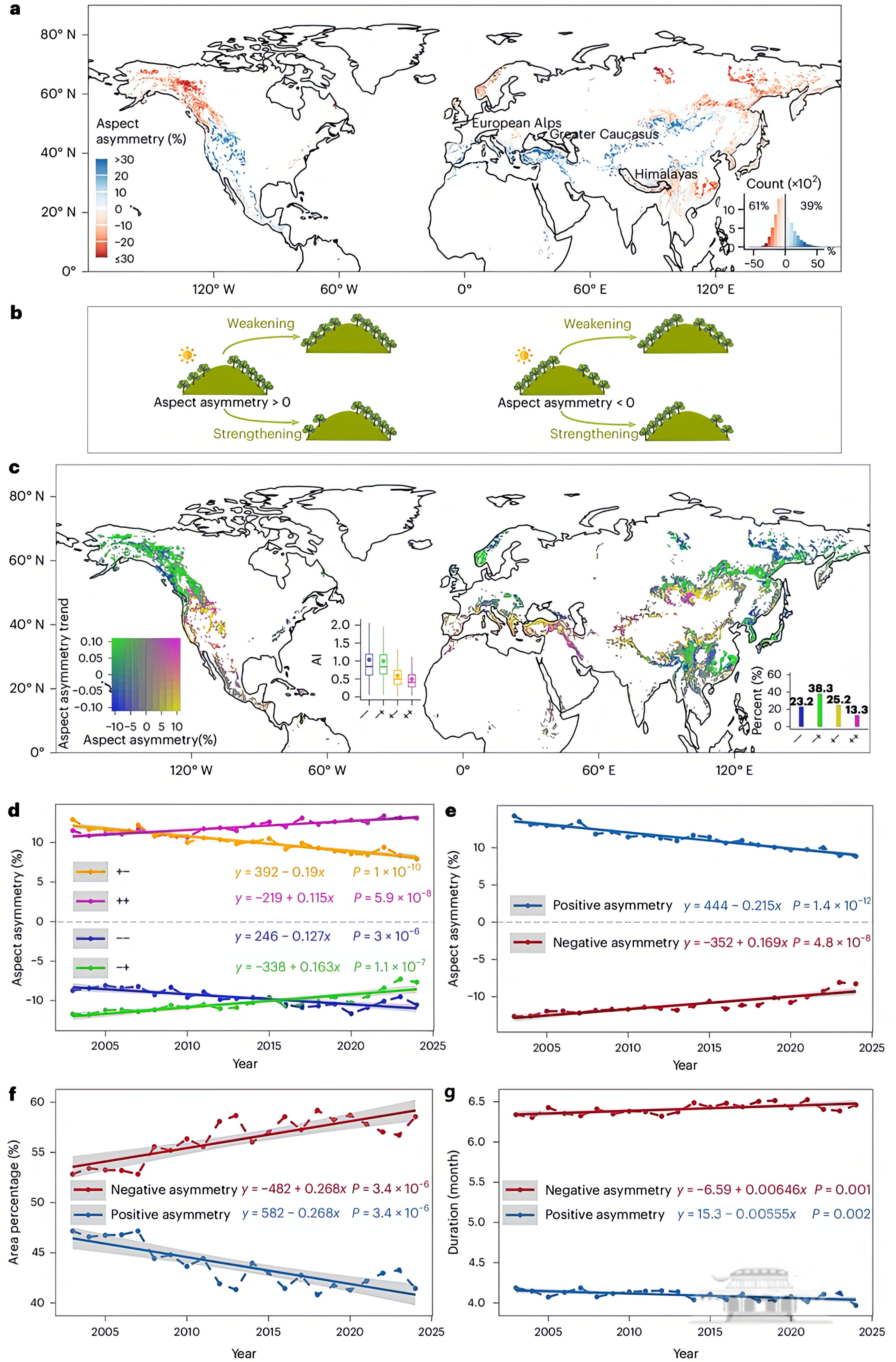 研究基于遥感叶面积指数数据,量化了北半球朝向极地(阴坡)和朝向赤道(阳坡)的不同坡向间植被密度差异,刻画了其空间格局:在中纬度较干旱地区,阴坡水分条件更好,植被更为茂密;而在高纬度较湿润地区情况则相反,阳坡太阳辐射和温度更高,植被更为茂密。在2003年到2024年间,植被密度的坡向差异度呈现减弱趋势,阴坡植被更茂密的地区,其强度、面积和年内持续时间均有所下降,而阳坡植被更茂密的地区,其强度减弱,但面积和年内持续时间增大,意味着水分对山地植被生长的限制减弱。进一步归因分析表明,太阳辐射与温度变化是植被坡向差异性变化的主导驱动因素。