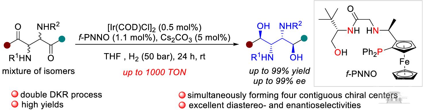 在本研究中,他们利用课题组开发的Ir/f-PNNO催化体系对外消旋2,3-二氨基-1,4-二酮的不对称氢化进行研究,利用连续动态动力学拆分策略,实现了含四个连续立体中心的手性邻二胺的高效合成。值得注意的是,该反应展现出优异的对映选择性和非对映选择性,能立体专一性地从32种可能的还原产物中生成单一目标手性分子。该反应的底物普适性好,催化效率高,使用0.1mol%的催化剂即可顺利实现产物克级规模的制备,为结构多样、功能丰富的手性邻二胺的高效合成提供了简捷实用的新途径。此外,所得产物中的手性邻二胺及氨基醇单元具有丰富的化学转化,可广泛应用于配体以及手性功能分子的合成中。机理研究表明,该转化经历了两次动态动力学拆分过程。该论文所发展的双动态动力学拆分策略为含多个连续手性中心链状分子的高效构建提供了新思路,具有重要的学术价值和潜在的应用前景。