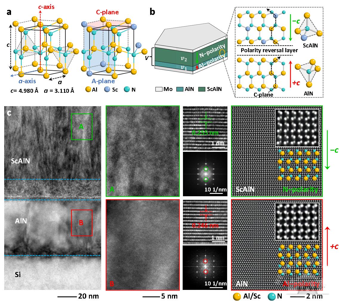 极性反转现象与器件双重优化策略示意图:(a) AlN与ScAlN晶体结构示意图;(b) 具有极性反转层的AlN/ScAlN双层结构FBAR示意图;(c)AlN与ScAlN双层结构截面形貌及极性取向表征。