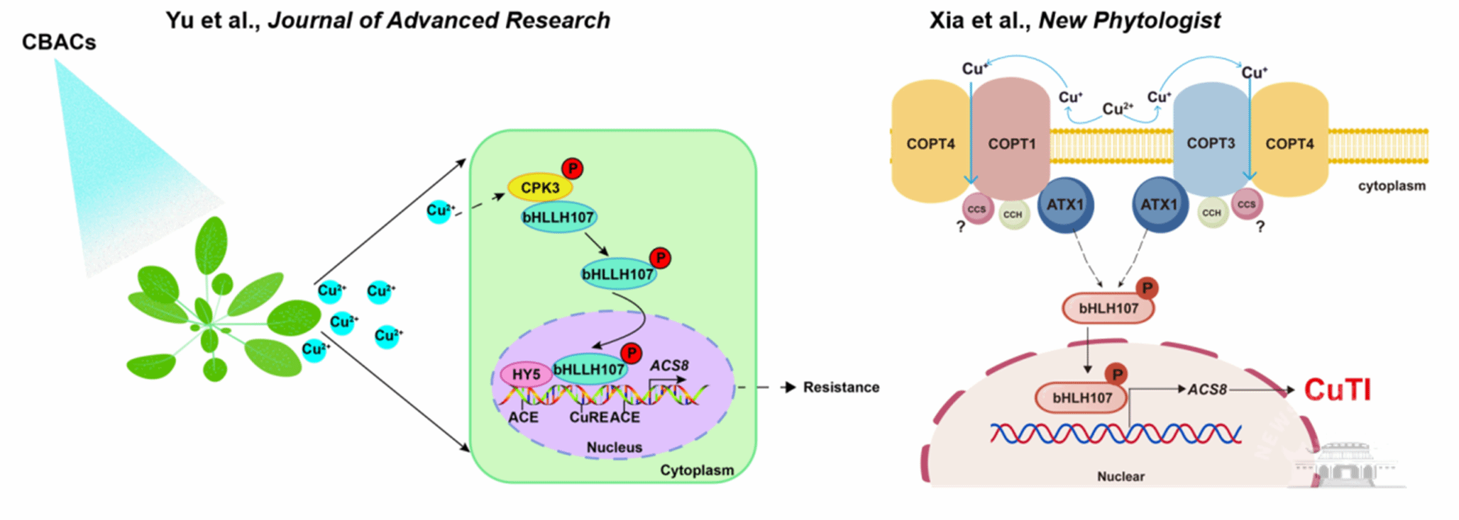 前期研究基础揭示—叶施铜(Cu2+)可特异性激活植物1-氨基环丙烷-1羧酸(ACC)合成酶8(ACS8)基因的表达,进而调控下游胼胝质积累、ABA合成及气孔免疫等抗病途径,增强拟南芥对PstDC3000抗性。两篇论文聚焦铜离子触发的上游信号识别,分别解析了CPK3通过磷酸化修饰激活碱性螺旋-环-螺旋(bHLH)转录因子bHLH107质核穿梭,细胞核内招募HY5协同调控ACS8的转录;细胞膜铜离子转运蛋白COPT4通过与COPT1与COPT3互作,形成冗余功能的异聚体,并协同铜分子伴侣蛋白ATX1激活植物细胞内bHLH107‒ACS8的Cu⁺响应模块,在胞内触发CuTI。系统地解析了铜离子被植物叶片细胞膜吸收、细胞质激活特异转录因子、细胞核诱发植物免疫反应的细胞“立体”空间信号传导网络,为指导铜制剂的复配、减药、遗传改良及利用等绿色高效农业生产技术提供了理论基础。