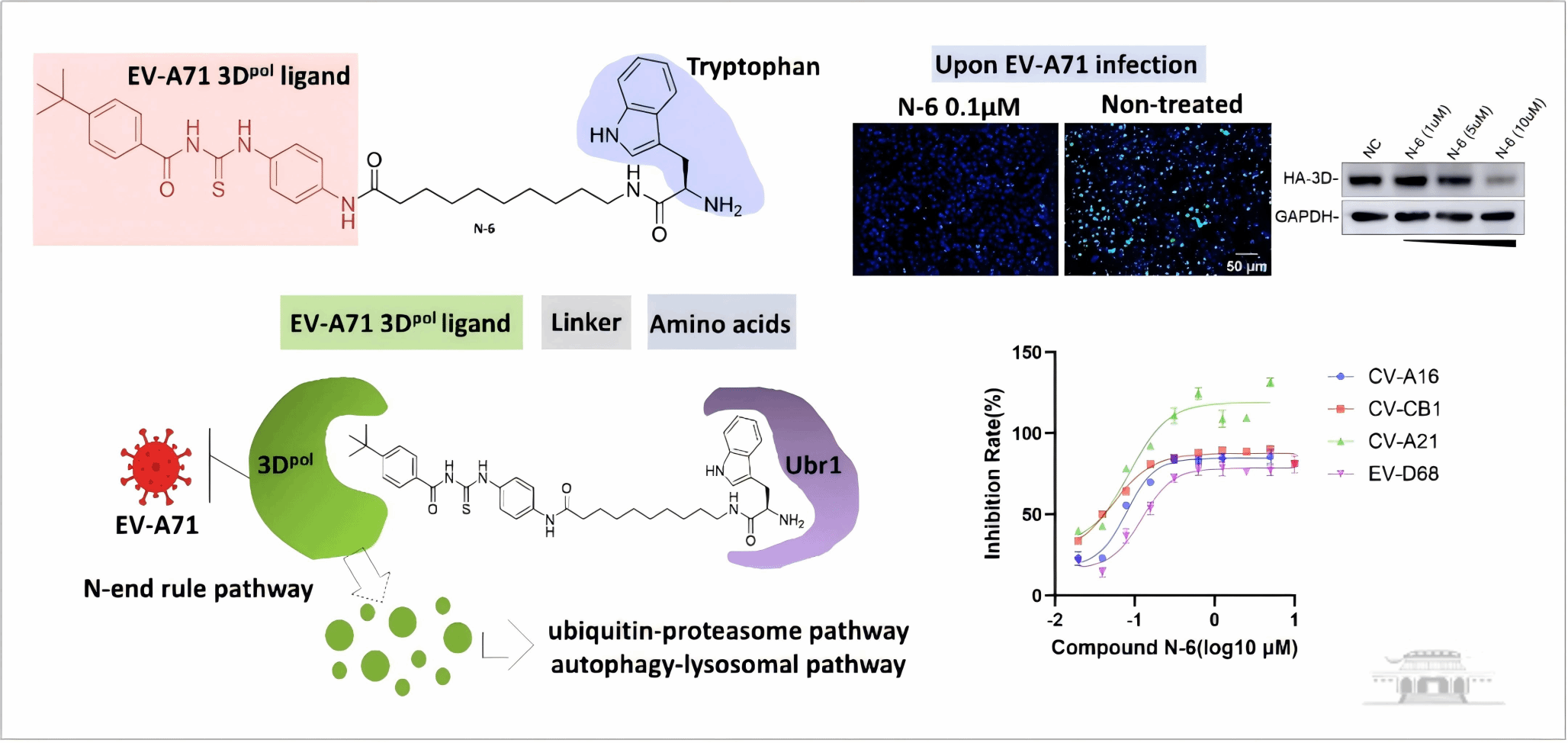 AATac化合物N-6靶向降解EV-A71 3Dpol及其广谱抗病毒效果示意图