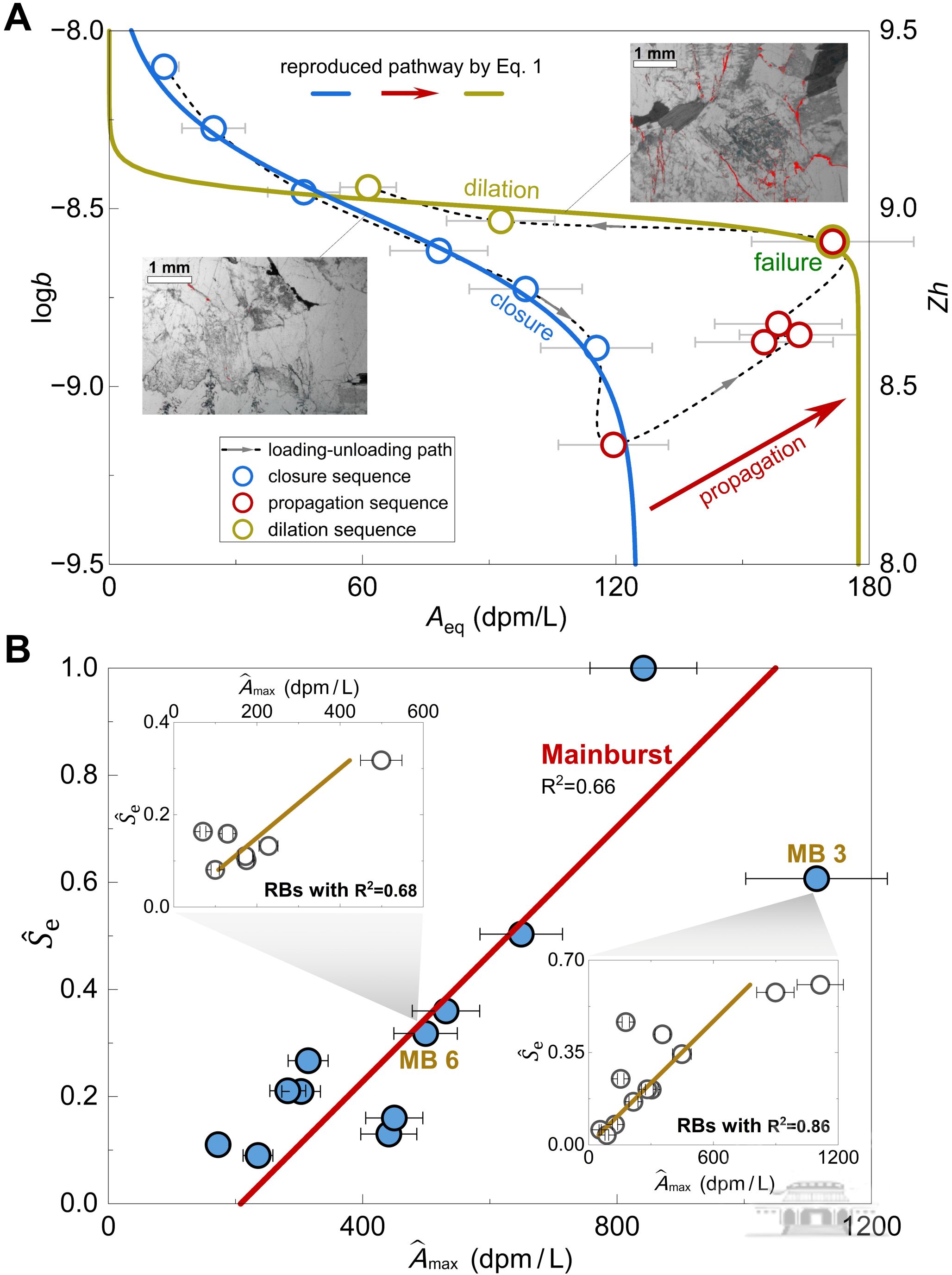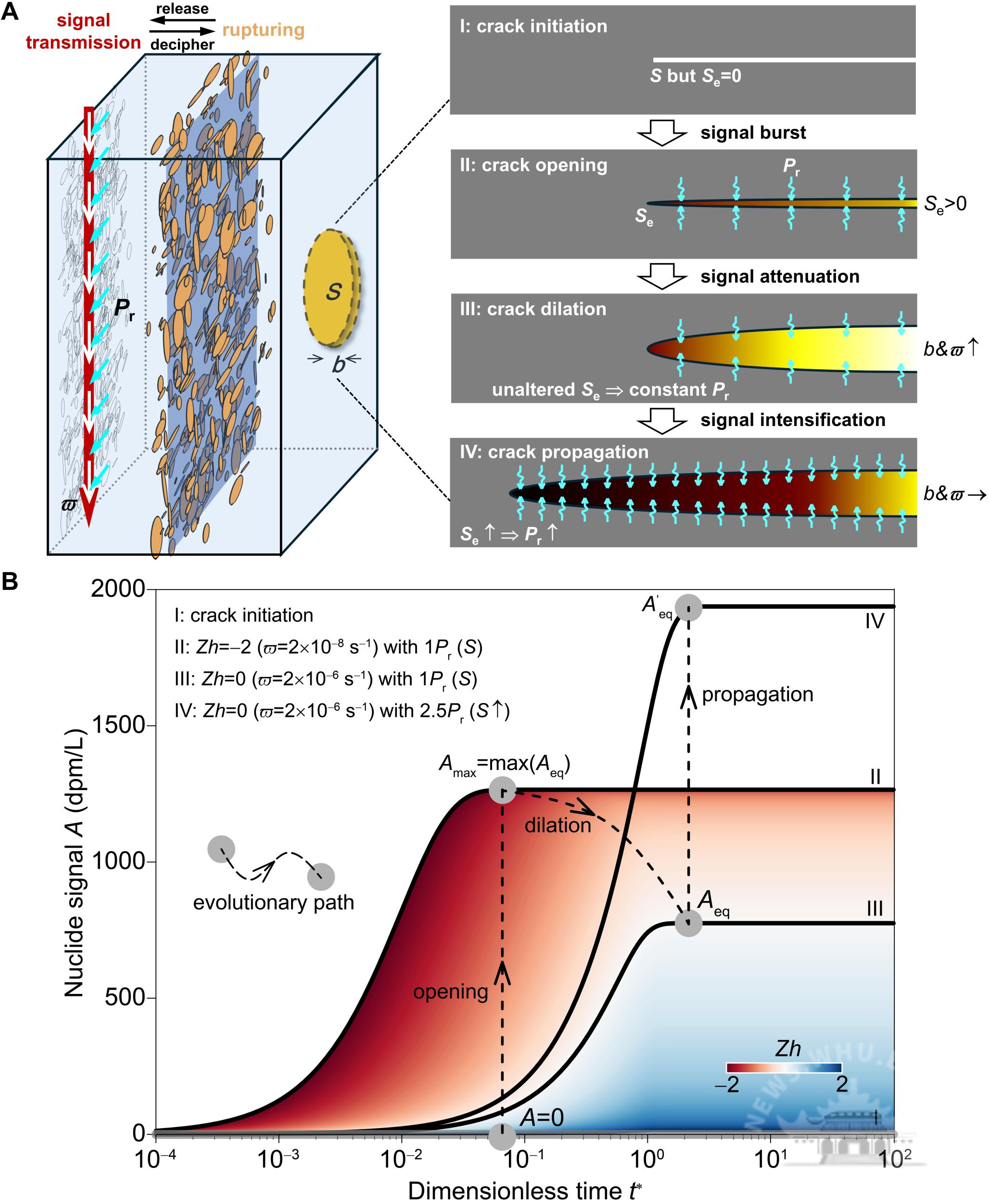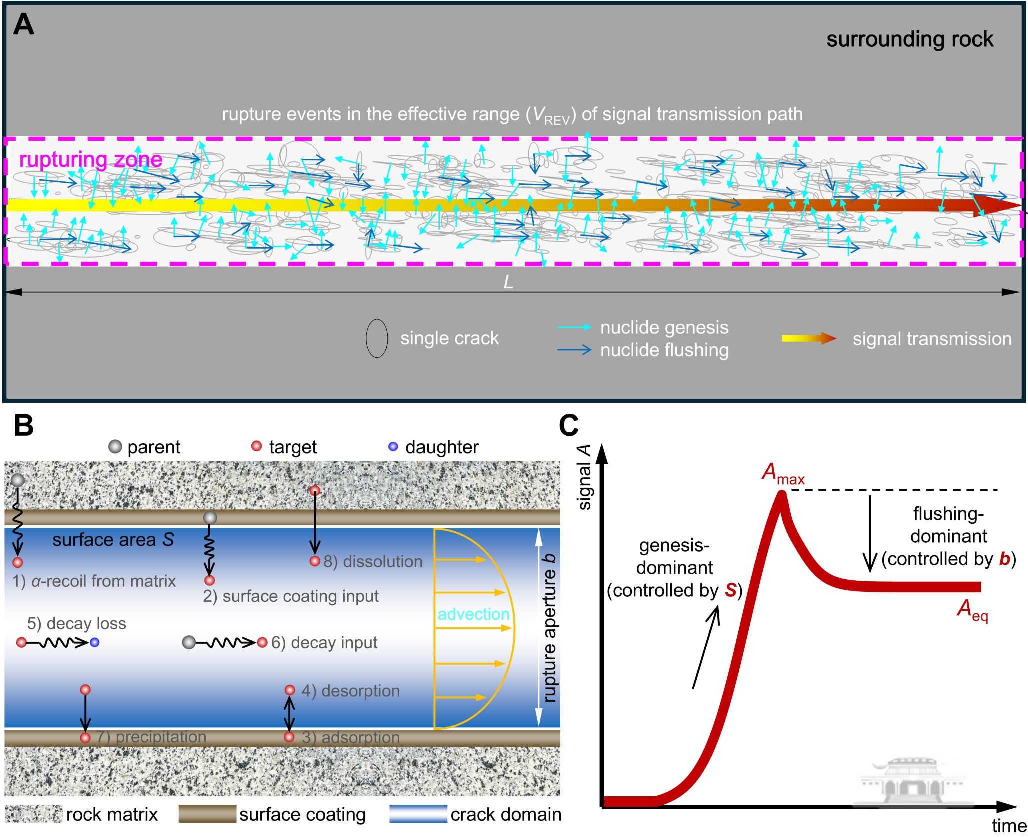 为此,研究团队首次提出了基于物理过程的天然放射性同位素长时序信号分解与重构方法,结合室内长周期岩石破裂试验、库岸边坡变形多年观测数据研究,发现了岩石变形破裂过程中同位素信号演化的通用范式曲线。该曲线由瞬时脉冲信号(Amax)与衰减稳态信号(Aeq)两大核心特征构成,并分别与岩石破裂面积(Se)与破裂开度(b)两大关键结构参数关联。通过严谨理论推导,结合系统刻画母核α衰变生成、子核α衰变消亡、裂隙壁面吸附–解吸附、沉淀及风化等复杂物理化学过程的同位素信号演化精细模拟,建立了天然放射性同位素特征信号与岩石破裂关键参数之间的本构关系,据此构建了岩石破裂定量诊断理论与预测方法,实现了单个微破裂离散信号与岩体宏观破裂信号的有机统一,完成了从定性观测到定量评估的关键跨越。