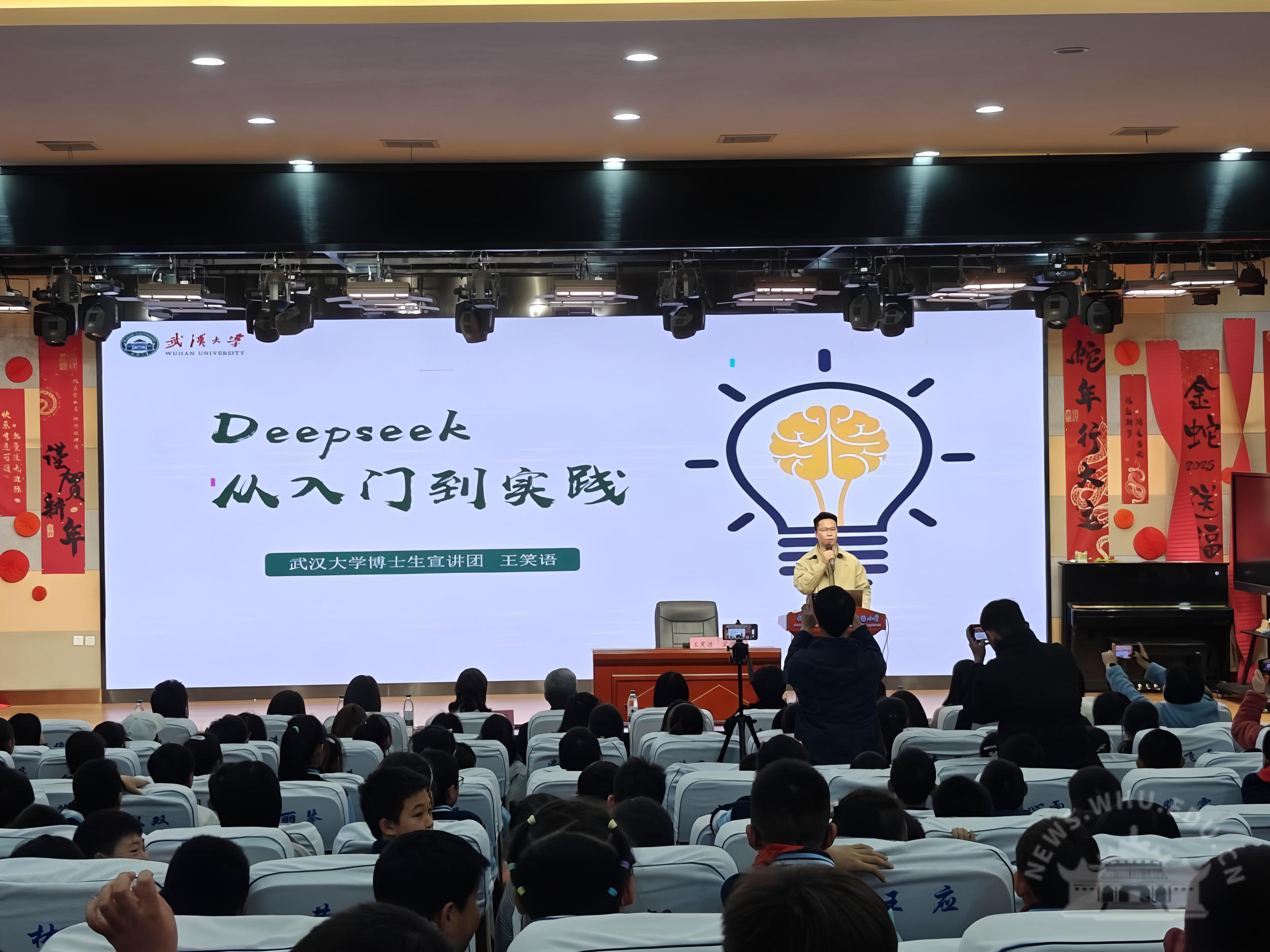 武汉大学博士生宣讲团讲师王笑语,以通俗易懂且生动有趣的方式,为在场的小学生们带来了《DeepSeek从入门到实践》的精彩宣讲。他以图文并茂的形式,深入浅出地介绍DeepSeek的基本原理和应用。