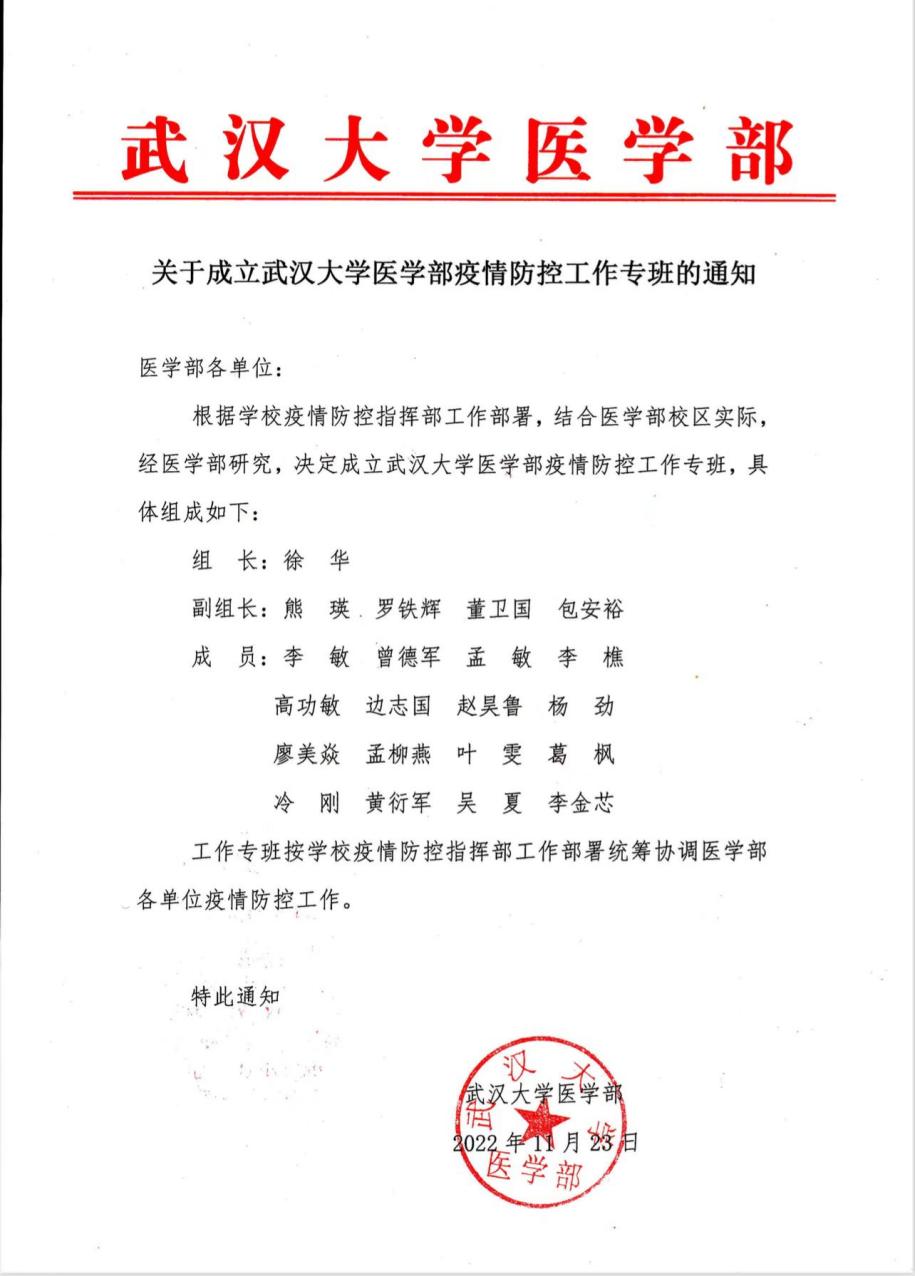 面对复杂严峻的防控形势,医学部领导班子迅速响应、科学谋划、统筹协调,第一时间成立武汉大学医学部疫情防控工作专班, 领导班子坚守岗位、靠前指挥,从组织各方力量开展防控,到督导医学部各学院落实防控责任、强化防控措施落地见效,从精准全面判断态势到及时传达学校各项疫情防控紧急政策,经连日奋战,目前各项防控工作有力有序开展。