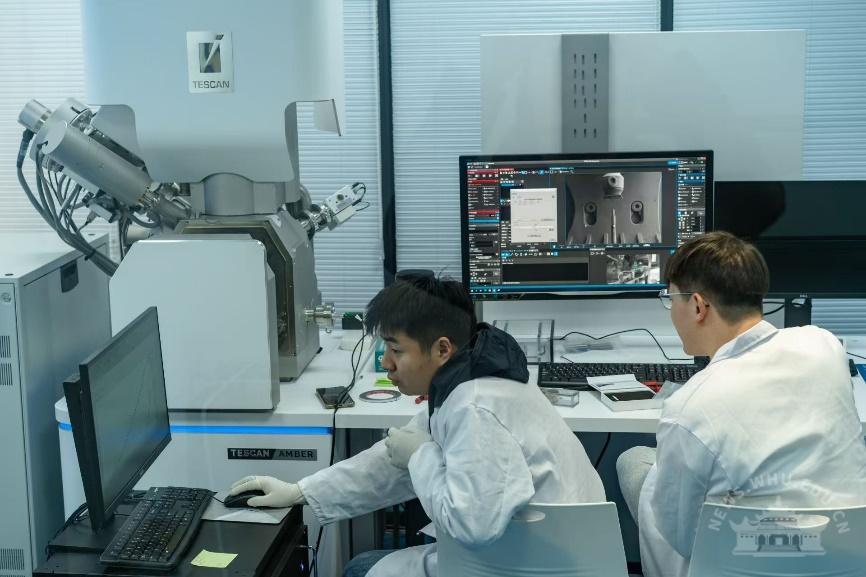 团队教师田文祥(左1)和博士生张思凡(左2)在实验室开展材料微观实验研究。