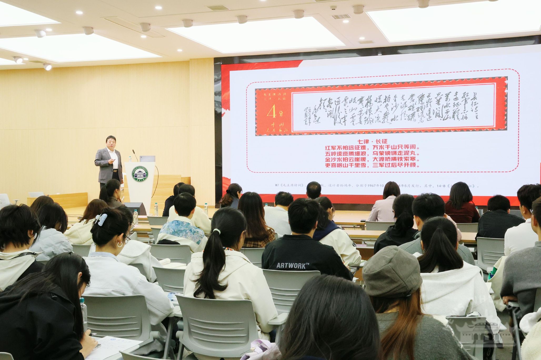 武汉市集邮协会第十届常务理事苏清应邀担任主讲人。他以长征题材系列邮票为脉络,从图案构思、诗词墨韵与邮戳印记入手,阐述了其中蕴含的长征征战、重要会议、英雄人物及诗词文化,解读长征精神的深刻内涵与当代价值。讲课过程中,全场师生齐诵《七律·长征》,仿佛与革命先辈庄严对话。
