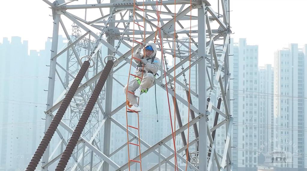 24号铁塔下,国网湖北电力超高压公司输电检修中心的陈颢元深吸一口气,手脚并用攀上铁塔。