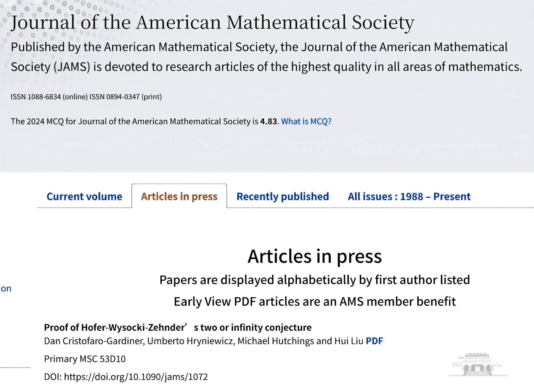 新闻网讯(通讯员肖玉霞)近日,《美国数学会杂志》(Journal of the American Mathematical Society)在线发表了武汉大学数学与统计学院教授刘会与合作者的最新研究成果。论文标题为“Proof of Hofer-Wysocki-Zehnder’s two or infinity conjecture”,研究成功证明了关于Hofer-Wysocki-Zehnder的二或无穷条周期轨道猜想和Bangert-龙以明的二或无穷条闭测地线猜想。